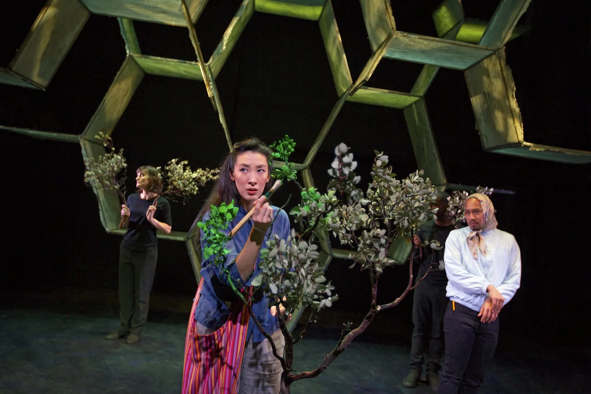 In the Crowded Fire Theater production now at the Potrero Stage (the newly and beautifully refurbished – and climate controlled! – space formerly known as Thick House), the sisters' journey plays out in about 90 engaging minutes, with the characters around the sisters adding a sense of whimsy and emotional heft to their separate journeys. Director M. Graham Smith establishes a world where anything can happen with a stage dominated by set designer Maya Linke's tattered and battered honeycomb sculpture. One minute we're in a well where Minhee meets a talking frog, and the next, we're at the American border, where Junhee interacts with a customs agent speaking English the way she hears it, which is to say, like garbled nonsense.