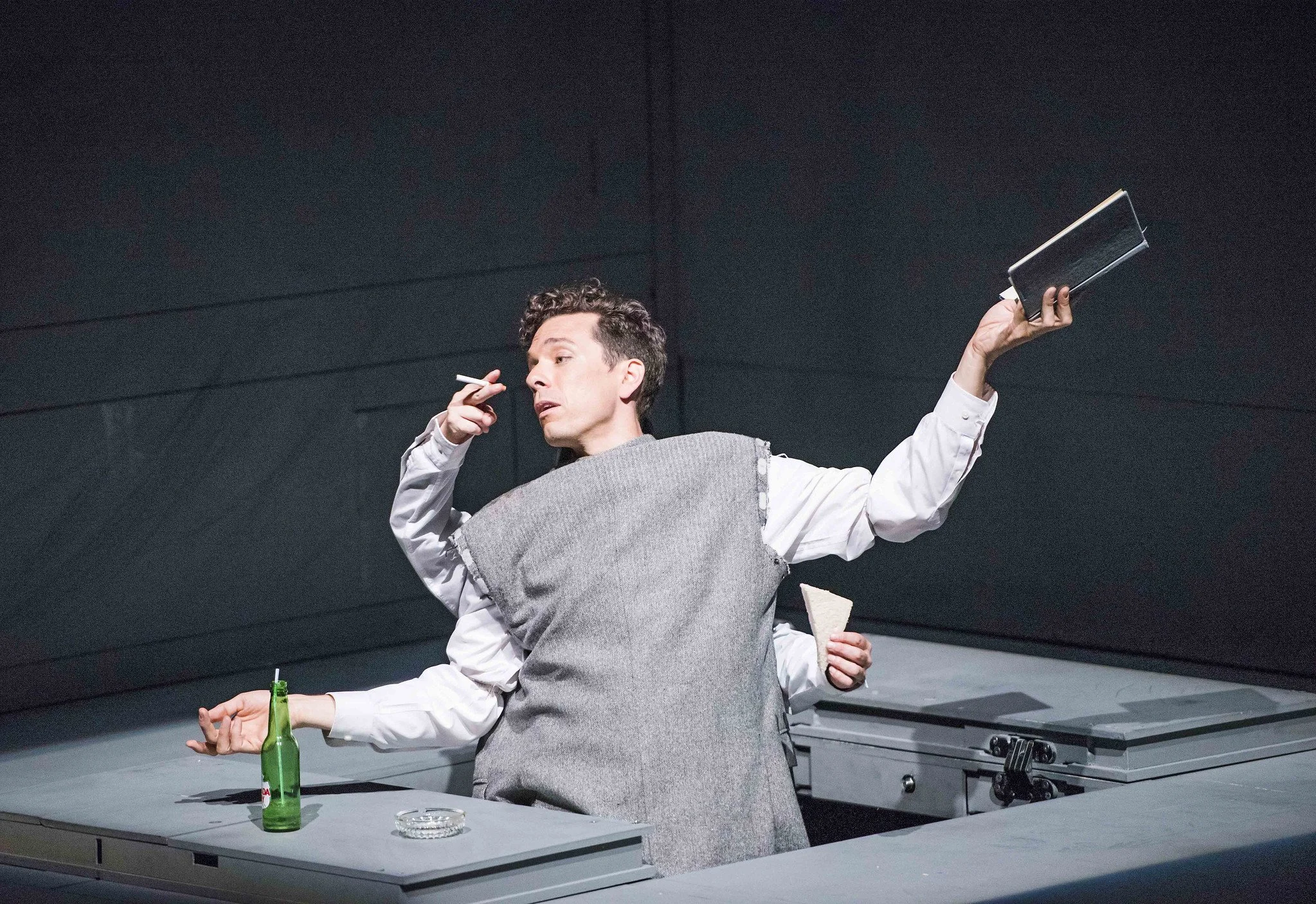 You could say it's still a one-man show...ish. There's a very Lepage-ish central character named Robert (Olivier Normand, an actor from Québec who is in Paris to narrate a documentary about jazz trumpeter Miles Davis' 1949 concerts in a Parisian jazz festival. He's also suffering intensely from a broken heart. From his room in the Hôtel de la Louisiane (Room No. 9, which is significant because it was once occupied by Jean-Paul Sartre and Simone de Beauvoir) he struggles through his pain leaning heavily on the music of Miles Davis, who appears as a silent, trumpet-playing character played by Wellesley Robertson III, and on the writings of Jean Cocteau, specifically his 1949 "Lettre aux Américains," written on his way back to France after spending time in New York.