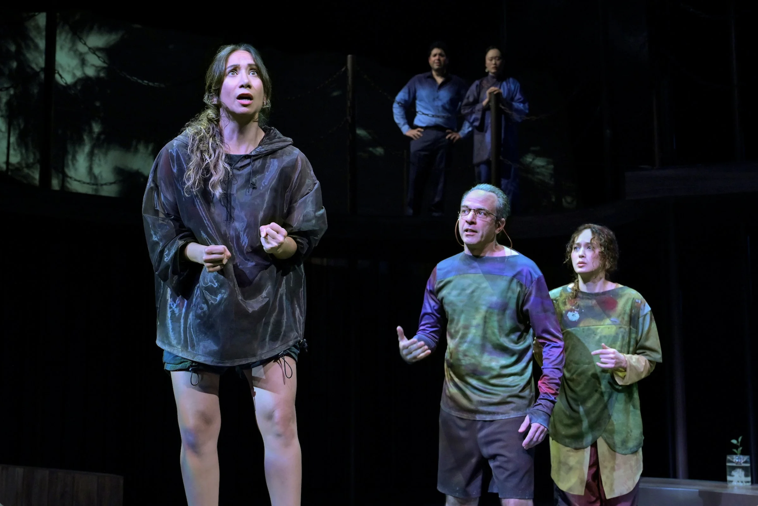 Monica Orozco (front left), David Mason (front center) and Emma Kikue (front right) are a family caught in an environmental catastrophe, while ancestors played by Ricardo Vázquez (rear left) and Michele Selene Ang keep a watchful eye. Photo by Kevin Berne